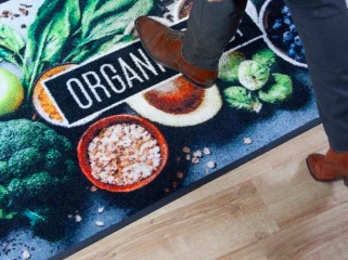 Matta med ditt egendesignade tryck för butik, kontor eller reception med många besökare .