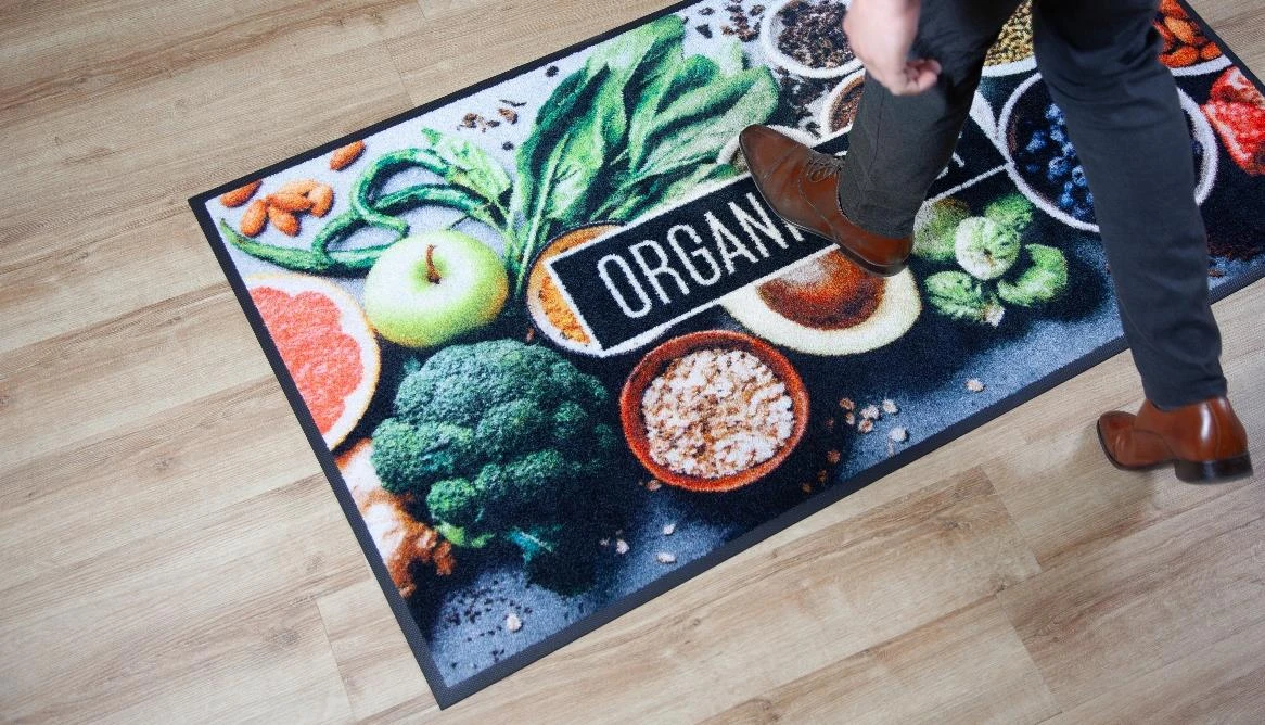 Matta med ditt egendesignade tryck för butik, kontor eller reception med många besökare .