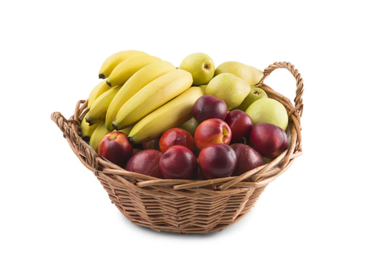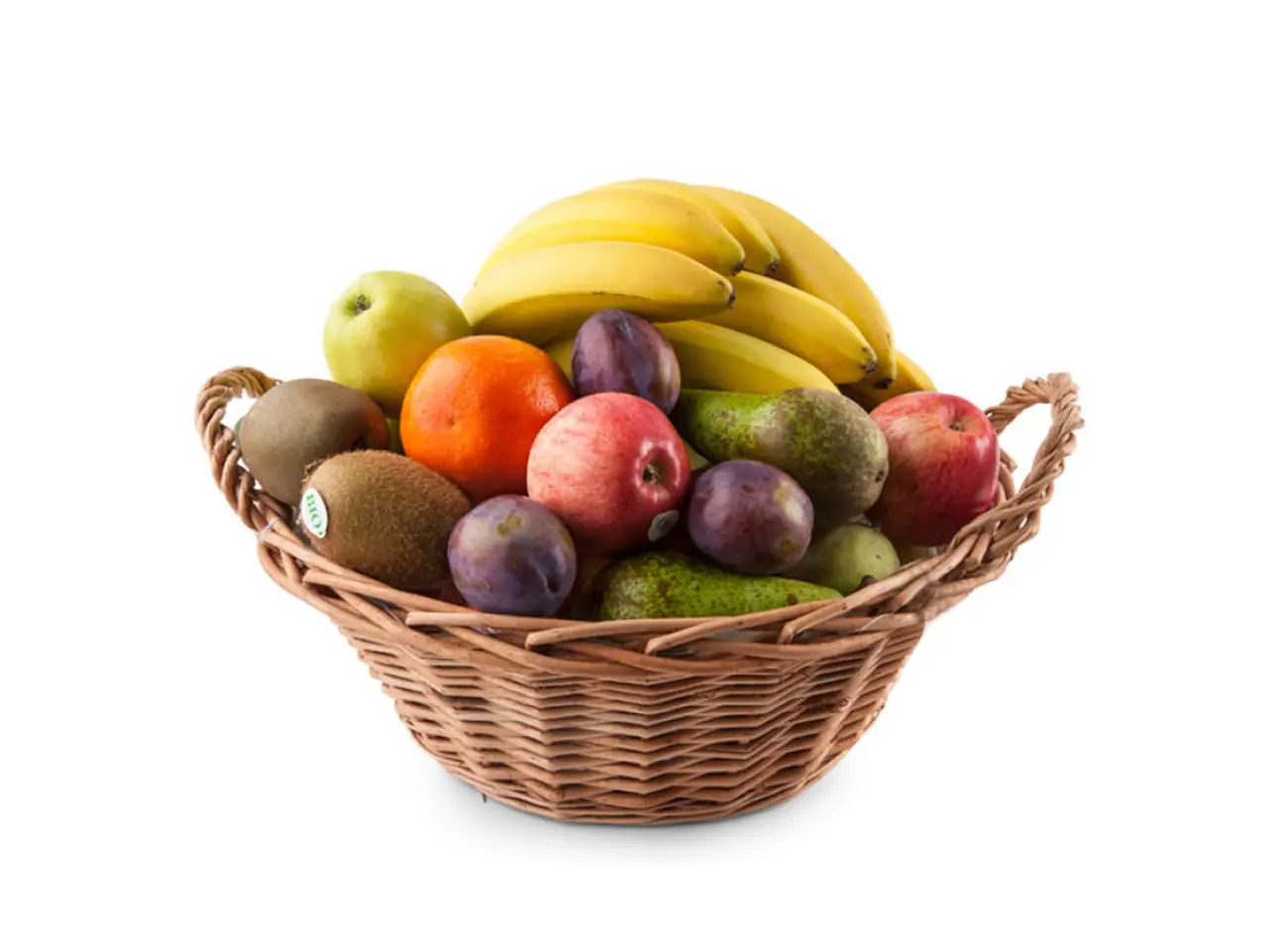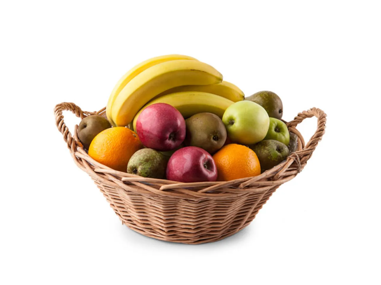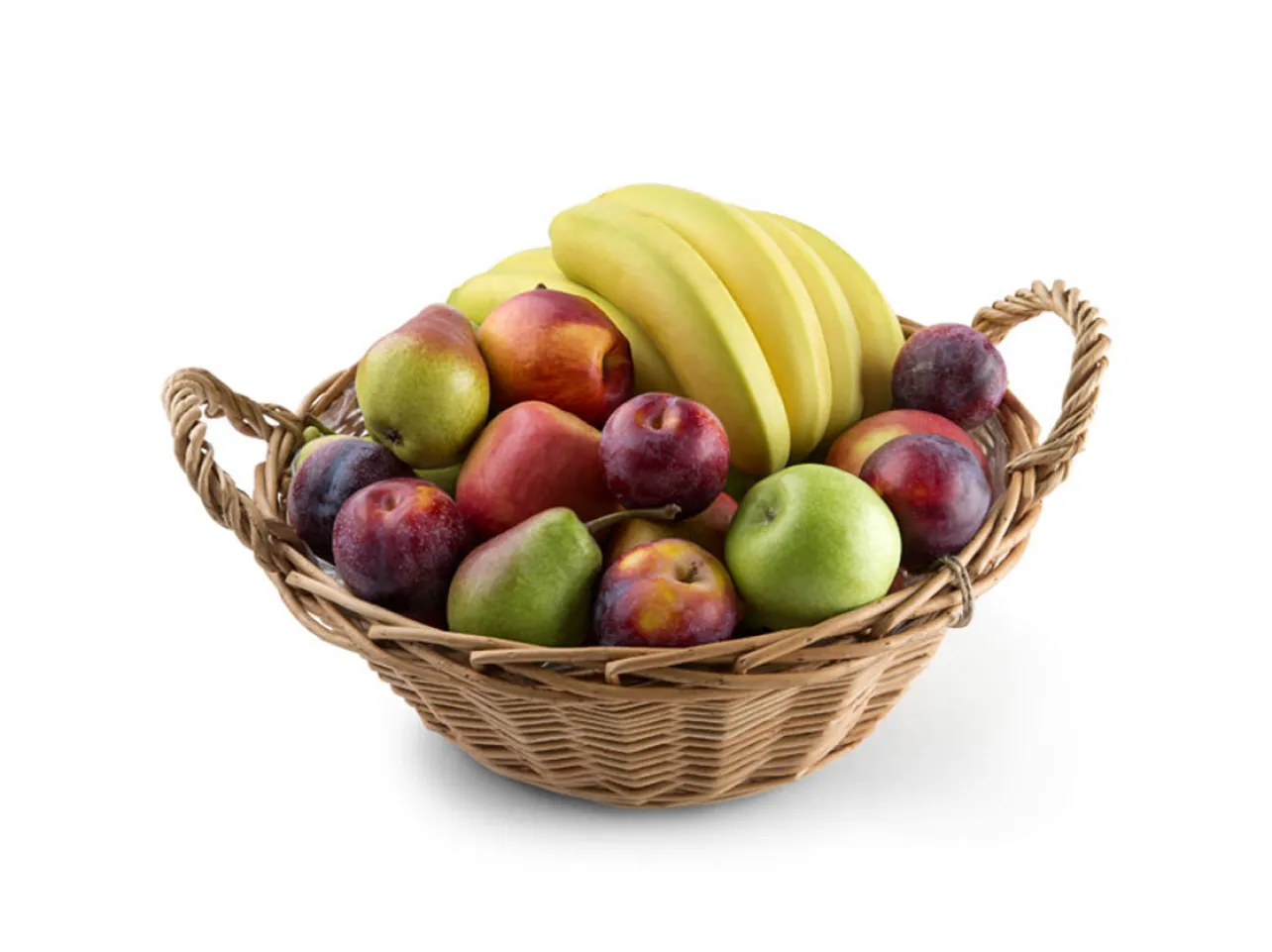 En enkel fruktkorg fylld med fräsch basfrukt som passar till mellanmål och fika.