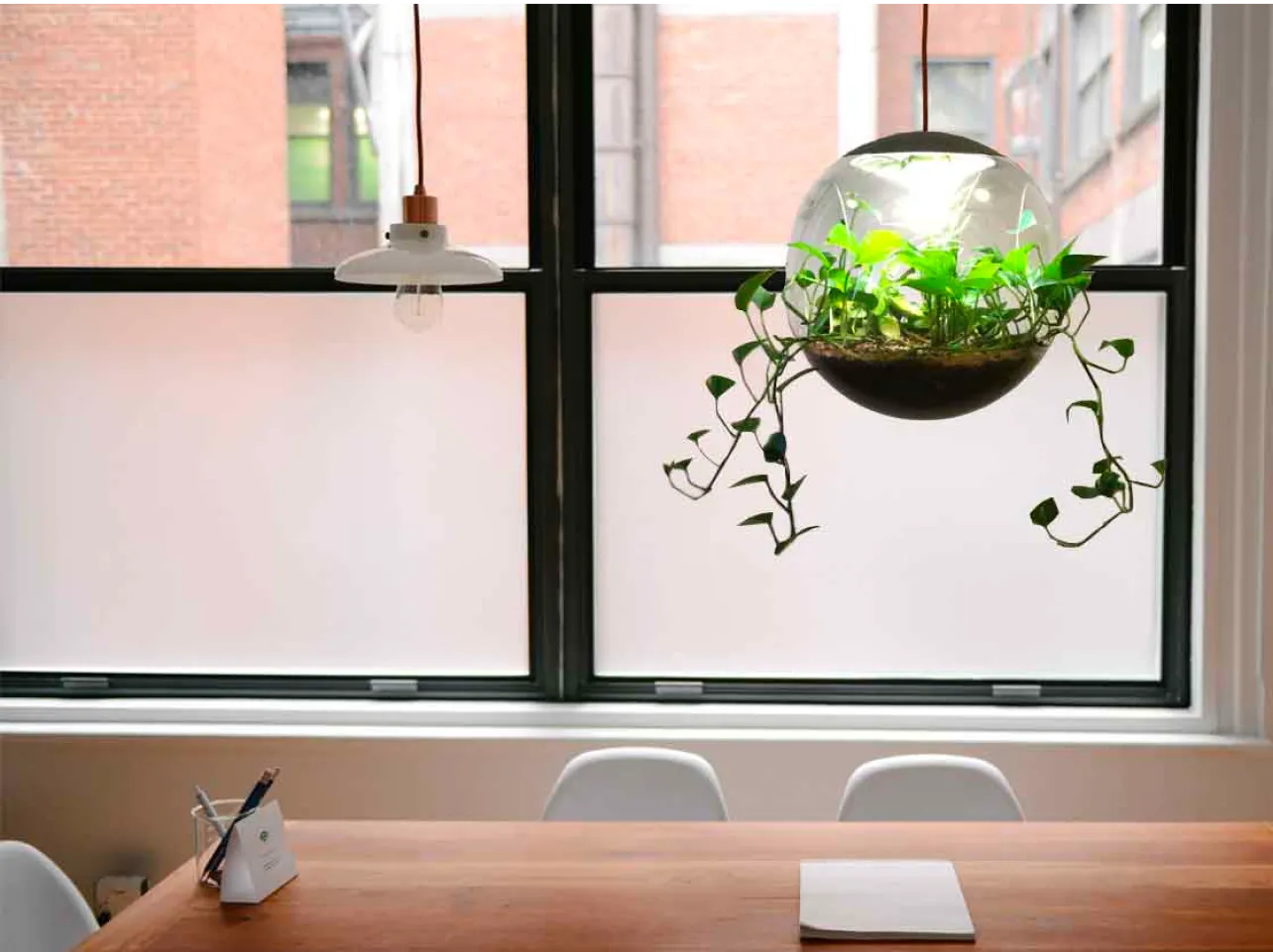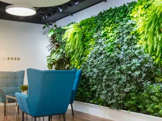 Gröna rumsavdelare, rogivande växttavlor, ljusa växtlampor, gröna tak och mosskonst på väggarna. Med våra växtmöbler skapar du trivsel på jobbet.