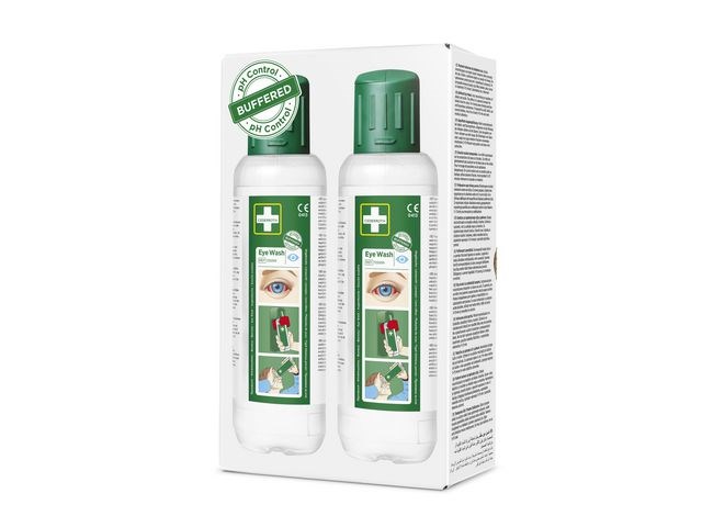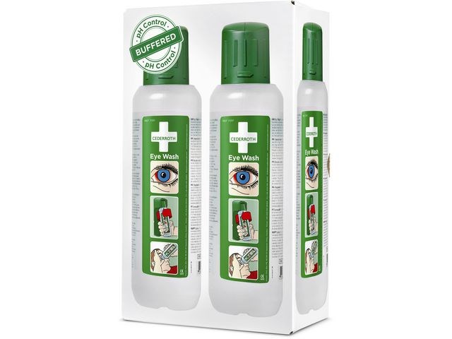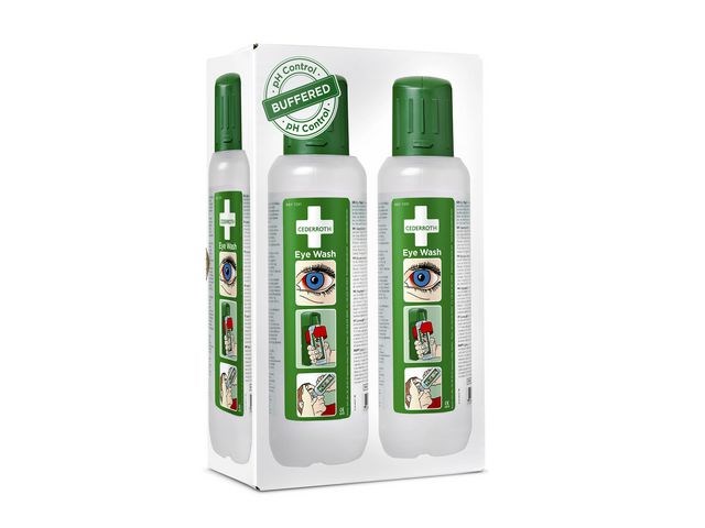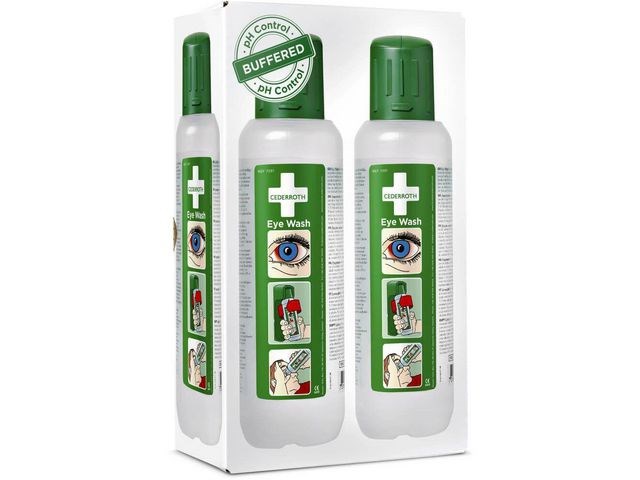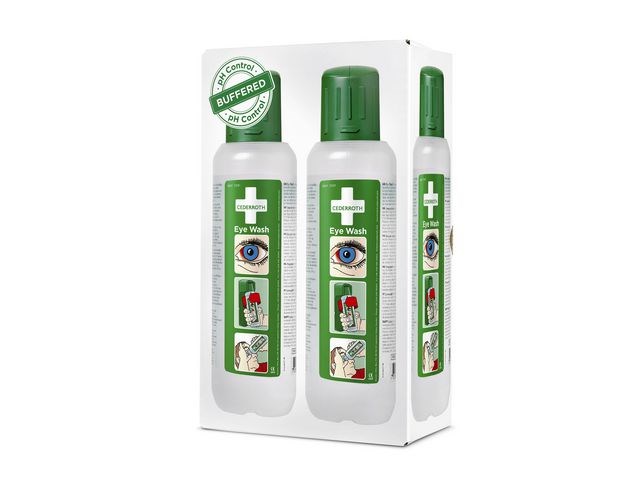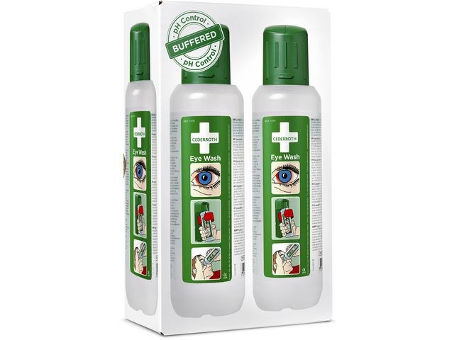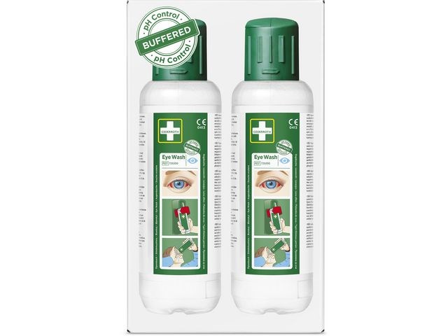 Cederroth Ögondusch har en funktionell design och goda sköljegenskaper. Cederroth Ögondusch verkar för att neutralisera ögats pH-värde, dvs den har en neutraliserande effekt på stänk av alkalier och syror vilket ger snabbare resultat än med vanlig koksaltlösning. Effekten är generellt starkare på alkalier än syror. Cederroth Ögondusch 2x500ml, innehåller steril, isoton, buffrad koksaltlösning utan konserveringsmedel. För engångsbruk.
