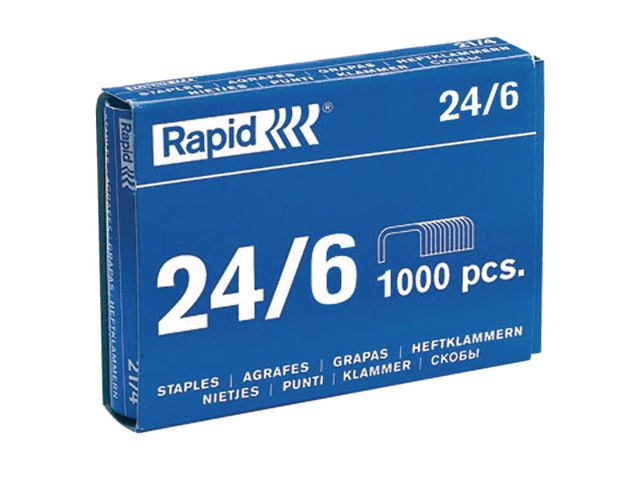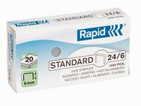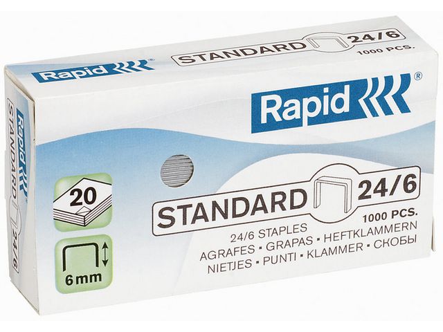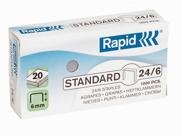 Standardklamrarna från Rapid® kan häfta ihop upp till 20 lösa ark åt gången. Standard-klamrar från Rapid® är tillverkade av mjuk och galvaniserad ståltråd som är mycket hållbar. De har en benlängd på 6 mm och vassa kanter som enkelt penetrerar flera pappersark. Dessa 24/6-klamrar är kompatibla med många olika Rapid®-häftapparater.