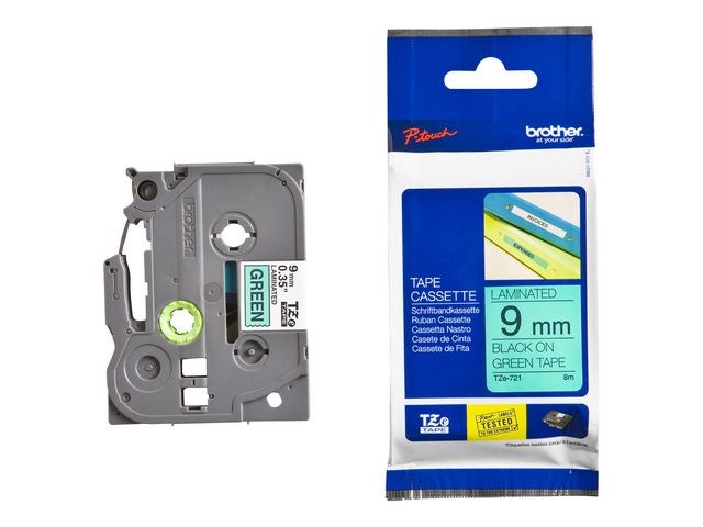 TZe721 etikettape fungerar perfekt med Brother P-touch märkmaskiner. Den laminerade, svart på grön, tapen är lätt att läsa och passar för märkning i hemmet, på kontoret eller andra arbetsplatser.