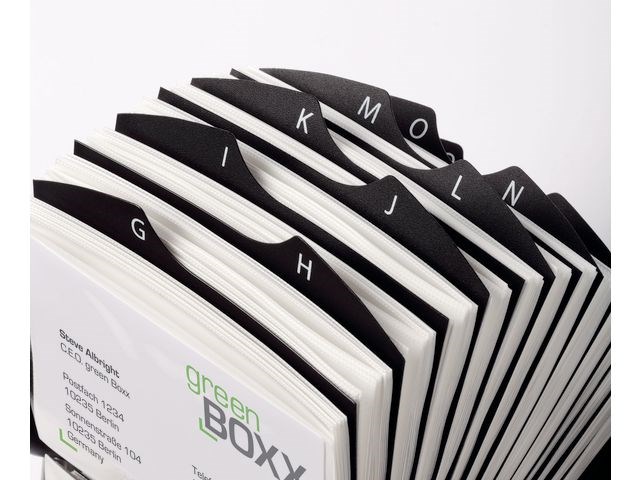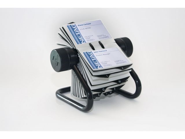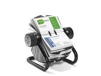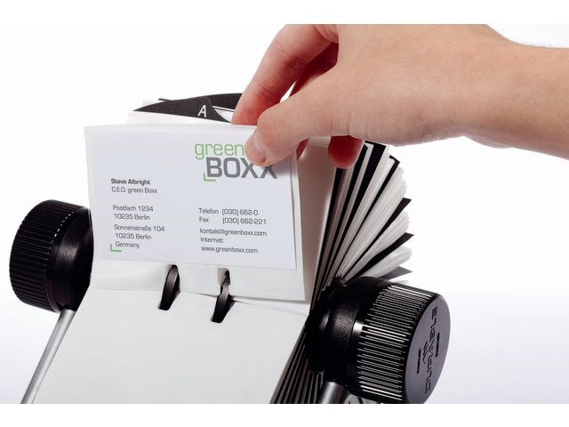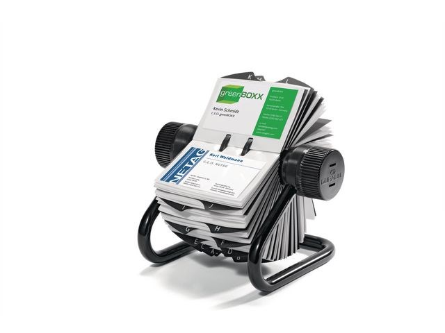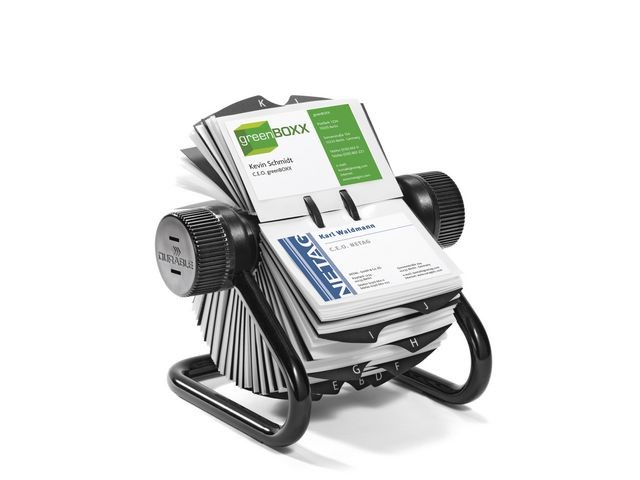 Lagra och visa visitkort med den praktiska visitkortssnurran Visifix från Durable, som levereras med ett organisatoriskt flikindex. Håll visitkort inom räckhåll med visitkortssnurran Visifix från Durable, som är tillverkad av slitstark plast och metall. Visitkortssnurran inkluderar ett alfabetiskt index i 25 delar och 200 visitkortsfickor. Använd knapparna på sidorna av visitkortssnurran Visifix från Durable för att rotera och snabbt hitta kontakter.