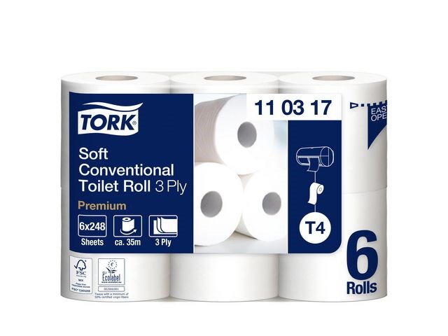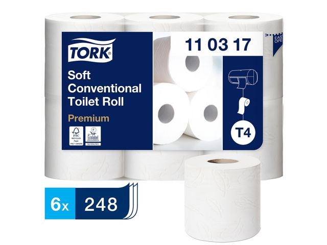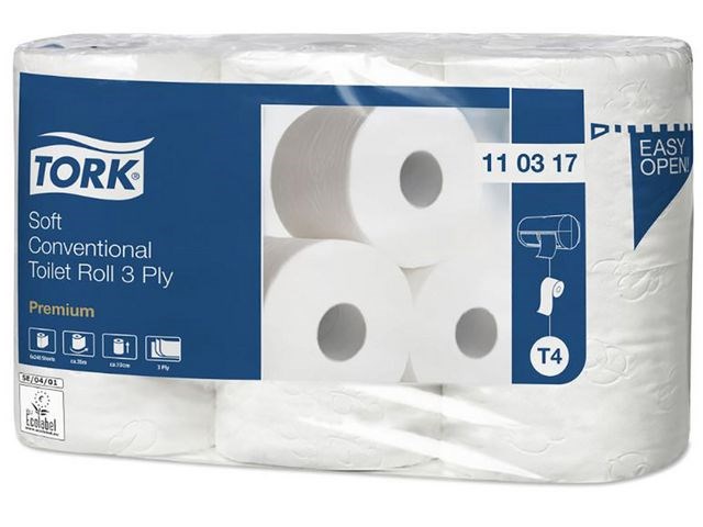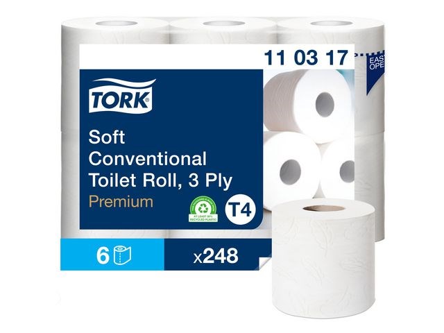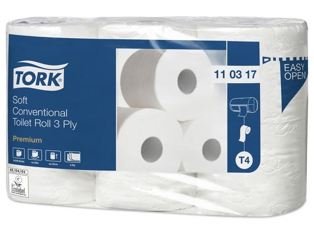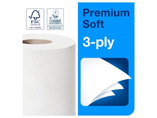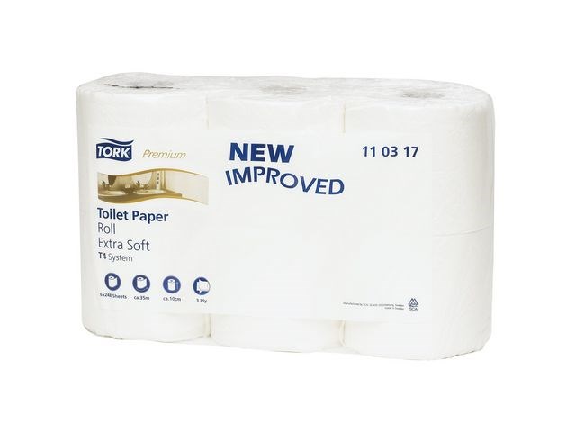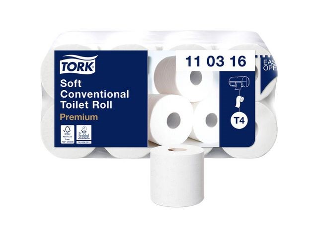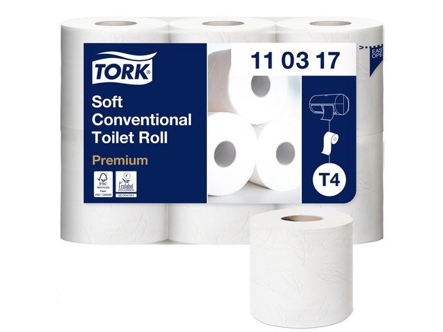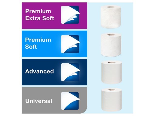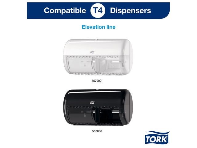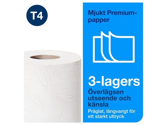 Garantera en oslagbar känsla och utseende med detta extra ljusa och mjuka toalettpapper. Se till att gäster i toalettutrymmen med låg besöksfrekvens känner sig lika bekväma som hemma med detta toalettpapper i premiumkvalitet. Dess mjukhet och ljusa utseende kombineras med en tilltalande mönsterprägling och hög prestanda, som skapar ett bestående, positivt intryck. Använd med Tork T4-dispensrar för toalettpapper för en bekväm upplevelse. Den unika avrivningsfunktionen gör det enkelt att komma åt papper. Kompatibel med Tork T4 dispensrar.