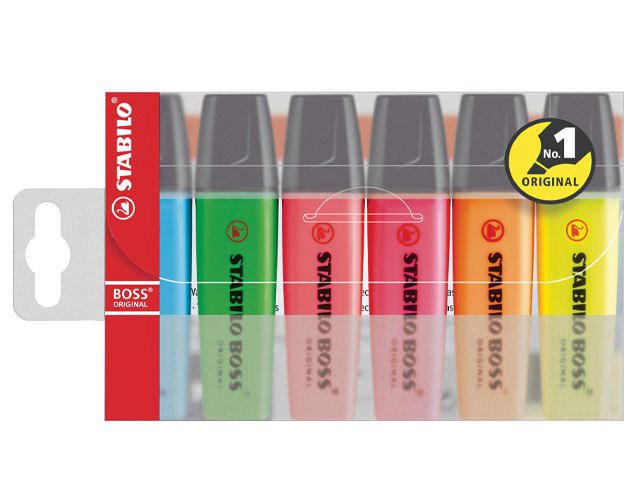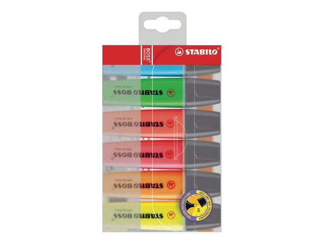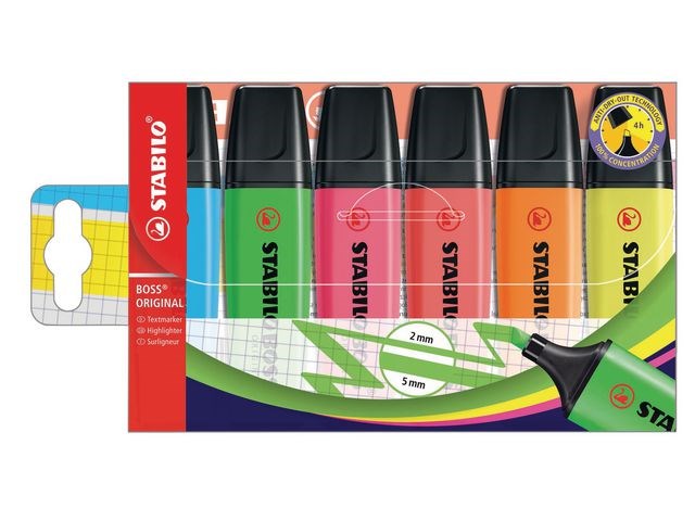 Markera text och viktig information med den klassiska överstrykningspennan STABILO® BOSS® ORIGINAL med Anti-Dry-Out-teknik. Originalöverstrykningspennan STABILO® BOSS® har ett tillförlitligt vattenbaserat bläck med Anti-Dry-Out-teknik så att korken kan vara av under 4 timmar utan att den torkar ut. Den kan användas på nästan alla typer av papper. Den har en snedskuren spets som ger dubbla linjebredder på 2 respektive 5 mm så att du kan använda den i många olika sammanhang, till exempel för att skriva, stryka under eller markera. Överstrykningspennorna från STABILO® passar perfekt för studenter och yrkesverksamma som måste läsa och markera viktig information i texter. Överstrykningspennan har den klassiska BOSS®-formen med en platt pennkropp som inte rullar iväg. Kollektionen levereras i en lättillgänglig plastförpackning och innehåller ett urval av 6 levande färger.