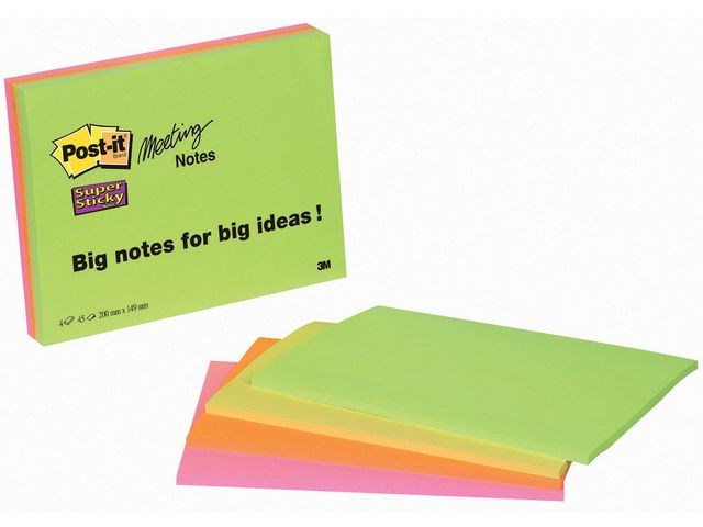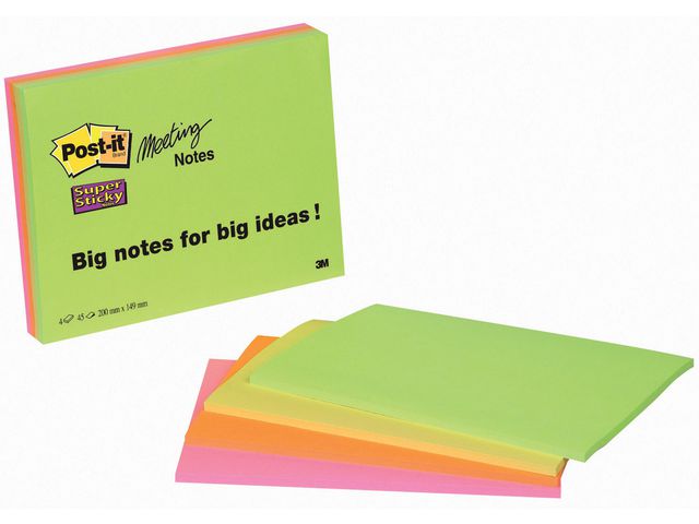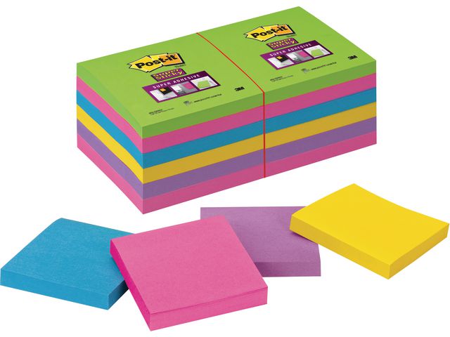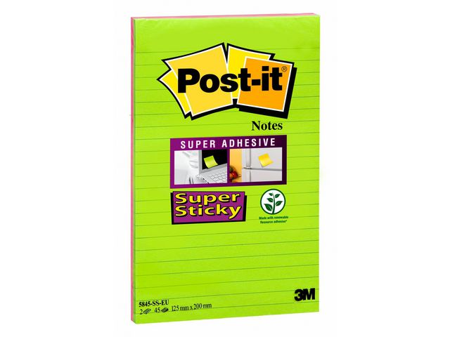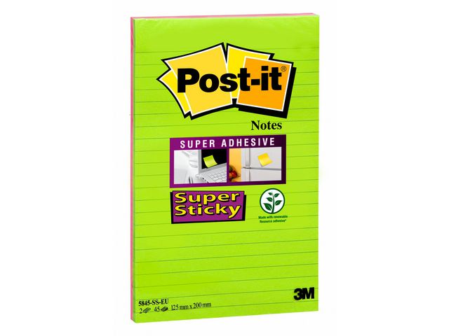 Post-it® Super Sticky-notislappar har ett starkt klister och fäster bättre på de flesta ytor än andra notislappar. De här linjerade Post-it®-notislapparna är perfekta för anteckningar under möten eller kontorsinformation. Notislapparna kan även användas till mycket annat, som att snabbt skriva ner ett telefonnummer och en att göra-lista, eller att anteckna idéer och lämna meddelanden till kollegor, vänner och familj. Post-it® Super Sticky-notislapparna är tillverkade av PEFCT-certifierade pappersfibrer och är ett miljömedvetet val för dina anteckningsbehov. Dessutom har lapparna ett klister som är tillverkat av 60 % återvunnet material. Med de stora flyttbara notislapparna kan du enkelt fästa, ta bort och flytta dina anteckningar utan att lämna märken på ytor som arkivskåp, dörrar och väggar eller inuti kalendrar, pärmar och anteckningsböcker. Ett paket med 2 block består av 2 klara färger att välja bland, vilket ger dina idéer en personlig touch och får anteckningarna att sticka ut. Varje block på 125 x 200 mm består av 45 Super Sticky-notislappar.
