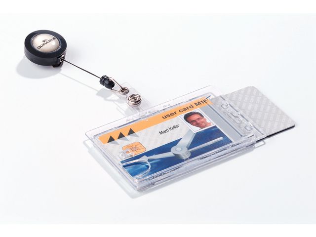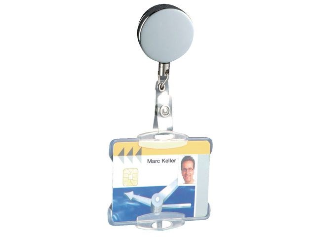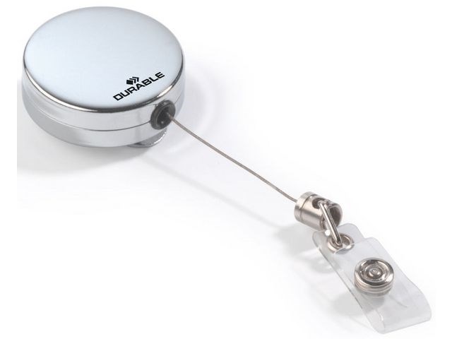 Med jojon DURABLE kan du sätta fast namnskyltar och ID-kort och hålla dem på plats. Den robusta jojon DURABLE är ett snyggt och praktiskt kontorstillbehör, eftersom den håller ID-kort som namnskyltar och passerkort på plats. Jojon är utdragbar till 80 cm för att ge snabb och enkel åtkomst till kort eller brickor. Dessutom har den en metallklämma som kan fästas i bältet eller skjortfickan. Tillverkad av PVC.