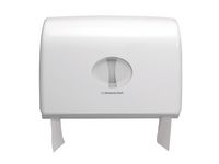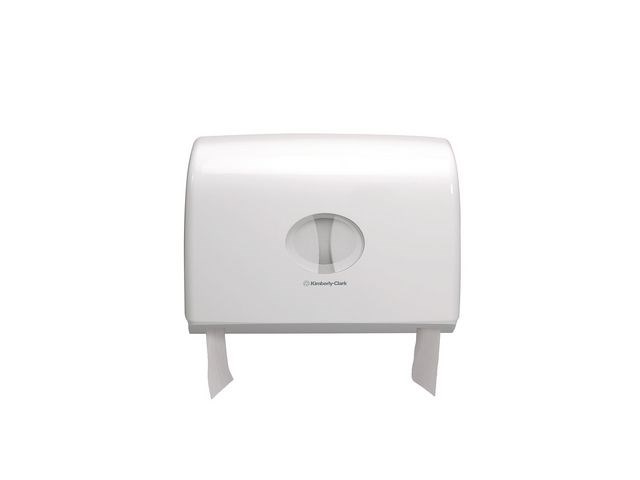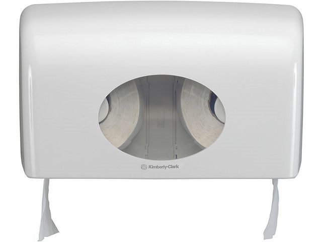 Den manuella Aquarius*-toalettpappersdispensern från Kimberly-Clark Professional* är utformad för användning med två små toalettpappersrullar och är tillgänglig med en tryckknapps- eller nyckellåsfunktion. Dubbla fördelningsluckor möjliggör optimal användning på platser med många människor. Främja exceptionell hälsa och hygien på platser i ditt företag eller fritidsutrymme med många människor med denna kompakta dispenser för dubbla toalettpappersrullar. Spara utrymme genom att montera den på väggen och spara kostnader genom att låta enheten fördela enskilda servetter. Kompakt design som inte bara tar upp mindre väggyta i det gemensamma utrymmet utan också innebär mindre användning av plast under tillverkningen, för att på så sätt stödja en hållbar framtid för planeten. Ger användaren perfekt komfort och dess smidiga och sömlösa design ger ytterligare renhet och förbättrad hygien eftersom bakterier, smuts och damm inte får plats att samlas i några springor. Rengöringen är felfri, snabb och enkel. Idealisk för användning i allmänna utrymmen på skolor, gym, restauranger, hotell och kontor.