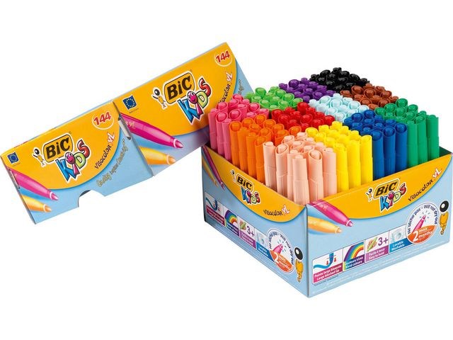 Intensiva färger efter varje användning. BIC® Kids VISACOLOR ¿XL filtpennorna har slitagetåliga spetsar som tål långvarig användning, där färgerna förblir lika intensiva vid varje användning. I förpackningen så finns det 12 st olika färger, med 12 st pennor/färg. Dessa BIC® Kids VISACOLOR ¿XL filtpennor har en stor pennkropp som låter barn öva på sin kontroll över pennor. Det vattenbaserade bläcket är tvättbart, vilket är användbart vid färgläggning av barn. Dessa filtpennor förlorar inte sin intensitet även om de lämnas öppnade under en längre tid. De levereras med ventilerade korkar som är kompatibla med kvalitetsstandarder för säker användning.