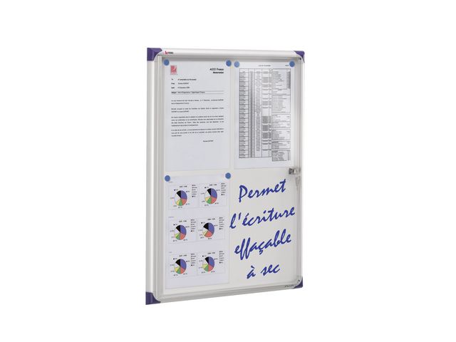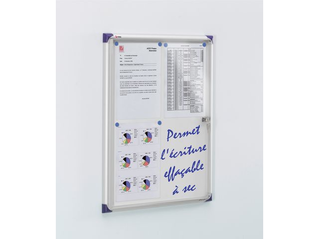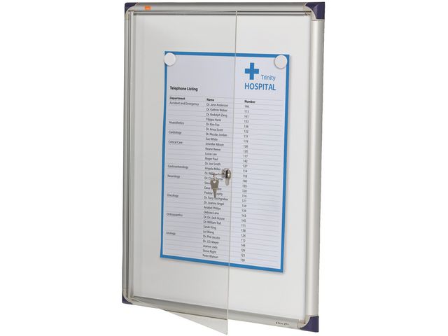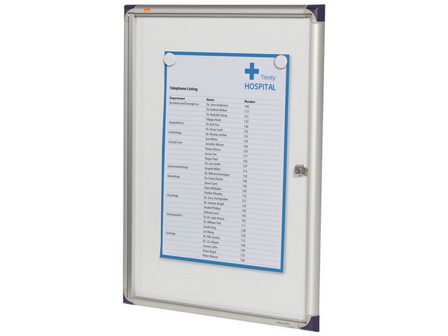Visa information på ett enkelt och säkert sätt med ett låsbart displayskåp. De här praktiska anslagstavlornas supertunna design innebär att de är perfekta för användning i korridorer och på arbetsplatser där det är mycket liv och rörelse. Använd magneter för att fästa anteckningar vid den magnetiska whiteboardytan eller skriv meddelanden med whiteboardpennor.