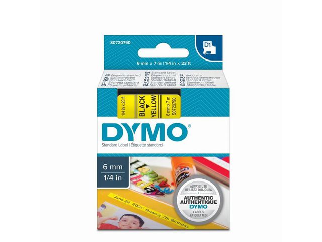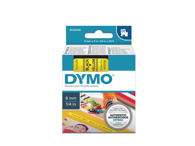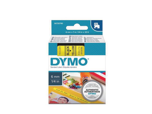 DYMO D1-etiketter erbjuder den prestanda och omväxling du behöver för alla typer av märkning, både inomhus, utomhus, på kontoret, i verkstaden, i butiken eller någon annanstans. Etikettkassetten DYMO® D1 på 6 mm ger snygga, skräddarsydda etiketter med svart text på gul botten som passar perfekt för användning både inomhus och utomhus. D1-tejp med text som har skrivits ut med termisk överföringsteknik