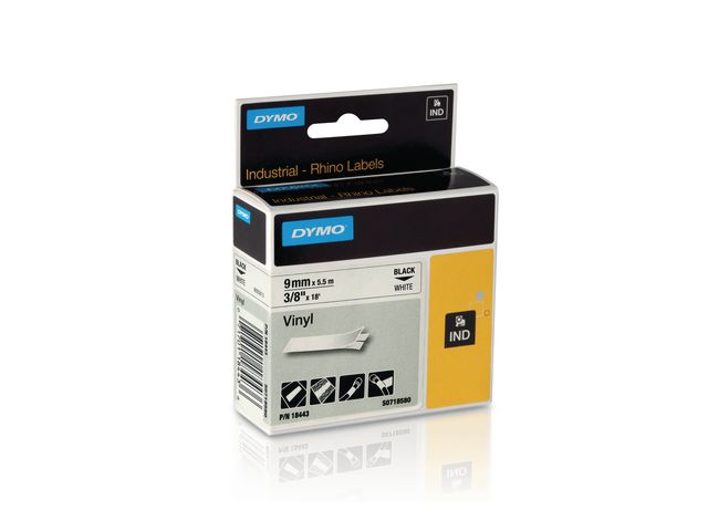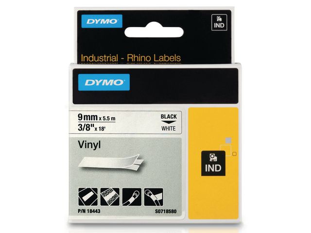 - i enlighet med ROHS Vinyltejpkassetten DYMO® Rhino på 9 mm matar ut slitstark vinyltejp med svart text på vit botten för industrietiketter som ska hålla länge. Perfekt för kablar och ledningar. Rhino-etiketter med text som har skrivits ut med termisk överföringsteknik
