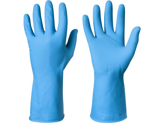 Slitstarka lite längre latexhandskar lämpliga för arbete inom livsmedelsindustri, laboratorier, städning, underhåll och montering i våta miljöer. Slitstarka, lite längre handskar som ger ett bra skydd för händerna och handlederna. Med ett räfflat mönster på handflatan och fingrarna vilket gör dem idealiska för användning i torra eller våta förhållanden. Med flockfoder på insidan. Produkten är CE-märkt.
