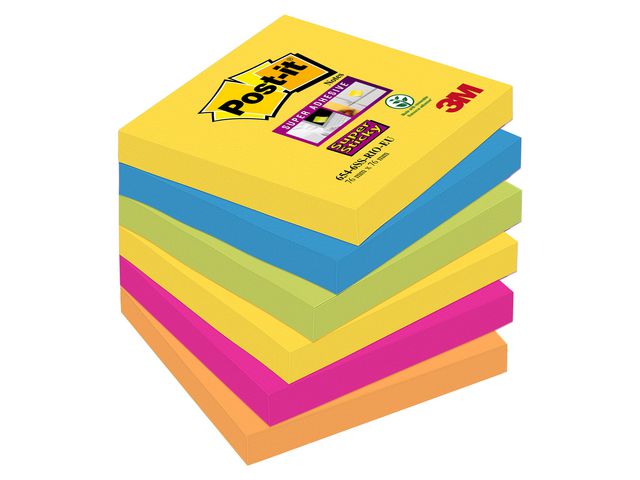 Post-it® Super Sticky-notislappar har ett starkt klister och fäster bättre på de flesta ytor än andra notislappar. Se till att dina anteckningar eller idéer syns med de här Post-it®-notislapparna. De är tillverkade av PEFCT-certifierade pappersfibrer och är ett miljövänligare val för dina anteckningar. Dessutom har lapparna ett extra starkt klister som är tillverkat av 60 % återvunnet material. Post-it®-notislappar är mycket mångsidiga och kan användas till mycket, från att snabbt skriva ner ett telefonnummer och en att göra-lista, till att anteckna idéer och lämna meddelanden till kollegor, vänner och familj. Med de flyttbara notislapparna kan du enkelt fästa, ta bort och flytta dina anteckningar utan att lämna märken på ytor som arkivskåp, dörrar och väggar eller inuti kalendrar, pärmar och anteckningsböcker. Varje block om 76 x 76 mm består av 90 Super Sticky-notislappar och levereras i en förpackning med 6 block i 5 olika klara färger, vilket gör dina idéer lite mer personliga och får dina anteckningar att sticka ut.