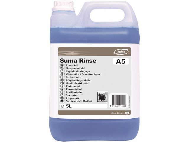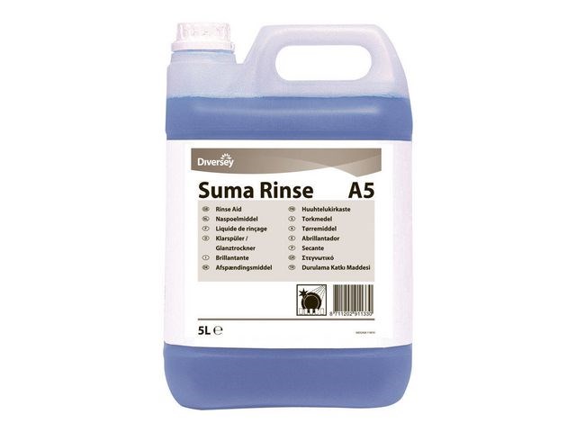 Suma Rinse är ett lågskummande neutralt torkmedel för diskmaskiner. Suma Rinse A5 är ett neutralt torkmedel, speciellt framtaget för att passa ett brett utbud av diskmaskiner. Produkten är uppbyggd av en unik kombination av nonjontensider som sänker vattnets ytspänning i sköljningsvattnet. Den här sammansättningen som genererar lite lödder fungerar bra i mjuka och medelhårda vattenförhållanden och är kompatibel med ett brett utbud av kommersiella diskmaskiner. Med sitt stora format fungerar sköljmedelsbehållaren bra för kommersiella kök, hotell och restauranger. Suma Rinse A5 passar alla professionella diskmaskiner med automatisk dosering. Dosera från 0,02 ml/L vid temperatur 80