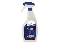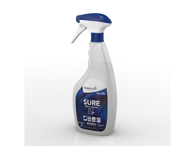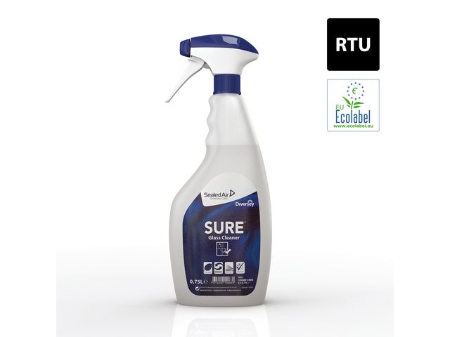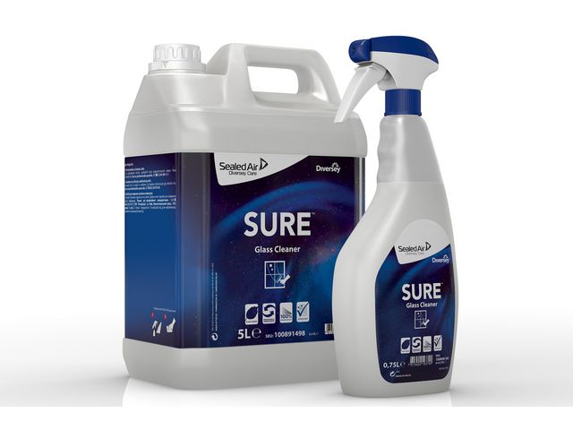 En miljövänligare lösning som ger dig rena och randfria glas. Du kan få glas och hårda ytor att glänsa utan att behöva påverka miljön. SURE Glasrengöring från Diversey använder naturligt växtmaterial som bas för en grundlig rengöring, och kombinerar professionella prestanda med hållbara åtaganden. Vätskan med den färska lukten torkar snabbt och jämnt på ytor som är fria från rester och strimmor. Det kan användas mycket effektivt på fönster, speglar och andra vattenresistenta och hårda ytor som keramik och plast. Det kan även användas som ett allrengöringsmedel. SURE-serien erbjuder professionella rengöringsprodukter som är utformade för att uppfylla kraven på effektivitet och tar även hänsyn till miljön och människors hälsa. Alla produkter är vegetabiliska och tillverkade av förnybara energikällor som är 100 % nedbrytbara och utformade för effektivitet.