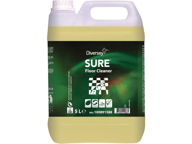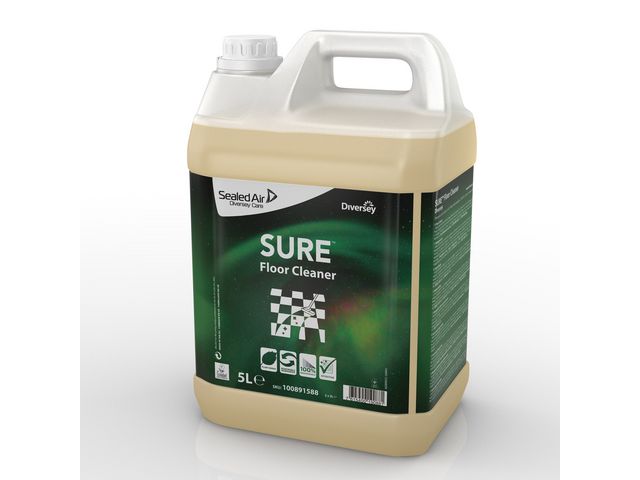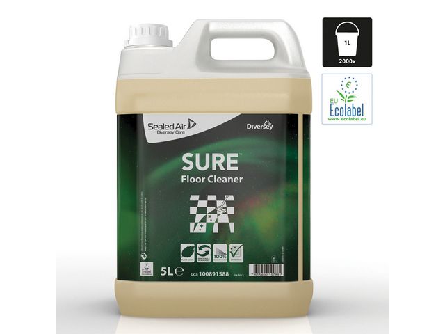 Ett säkert och miljömedvetet rengöringsmedel för daglig användning på alla vattentålig hårda golv. SURE Floor Cleaner från Diversey är ett miljömedvetet och väldigt effektivt val. Lösningarna är växtbaserade, 100 % nedbrytbara och använder förnybara energikällor. Det räcker med en liten dos för att du ska kunna känna dig säker på att dina vattentåliga golv ska bli effektivt rengjorda. Formeln är utformad för att förbereda golv för beläggning, vilket gör det enklare att avlägsna lim och rester för att bättre möjliggöra vidhäftning av ytterligare beläggningar. Den lågskummande formeln verkar snabbt och torkar med en klar och ren finish. Det är det perfekta valet för kombiskurmaskiner, men lämpar sig även för moppmaskiner och golvvårdsmaskiner. SURE-serien erbjuder professionella rengöringsprodukter som är utformade för att uppfylla kraven på effektivitet och tar även hänsyn till miljön och människors hälsa. Alla produkter är vegetabiliska och tillverkade av förnybara energikällor som är 100 % nedbrytbara och utformade för effektivitet.