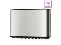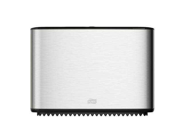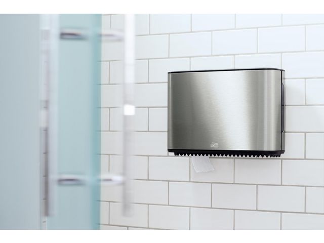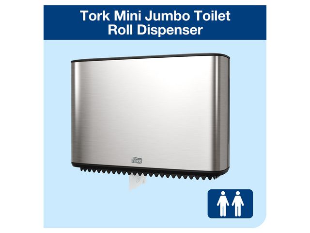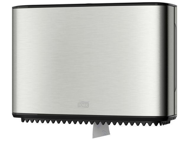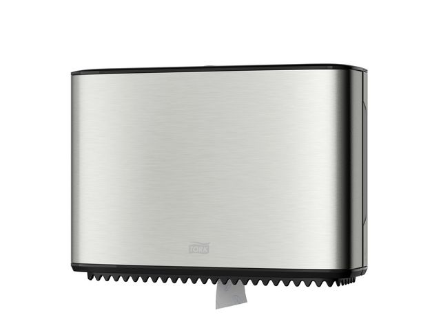 Dispenser utformad för Tork T2 toalettpapper. Dispenser med en modern design som passar in i alla toalettutrymmen. De släta ytorna och rena linjern ger ett trevligt intryck som alltid passar in och ger ett bra intryck. Den eleganta dispensern har ett hölje i borstat rostfritt stål med skydd mot fingeravtryck som förhindrar att dispensern ser smutsig ut.