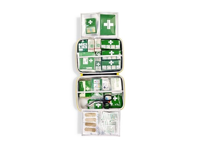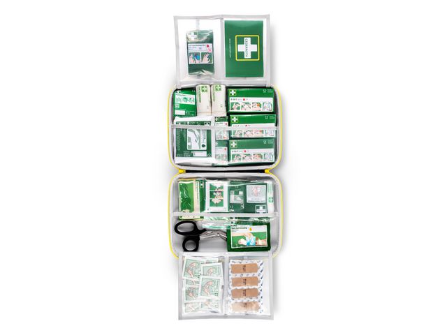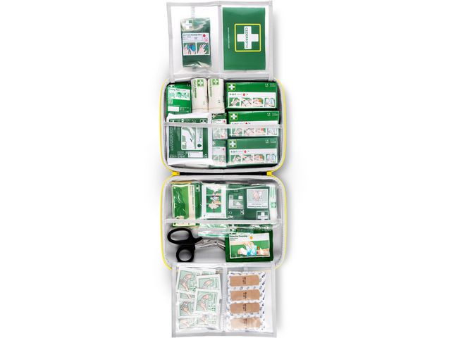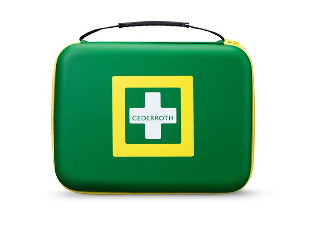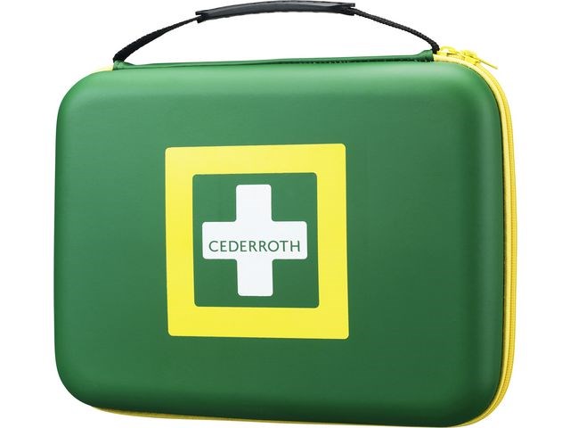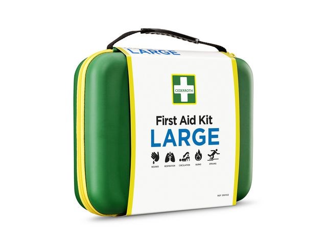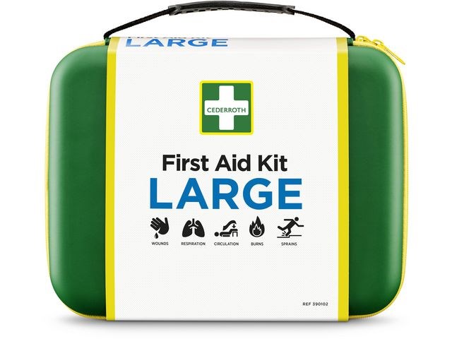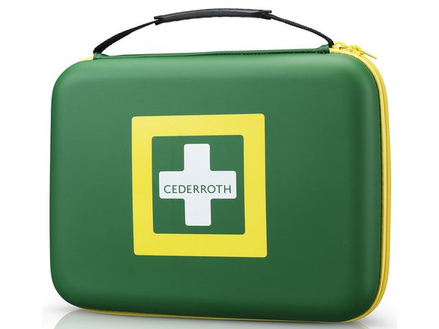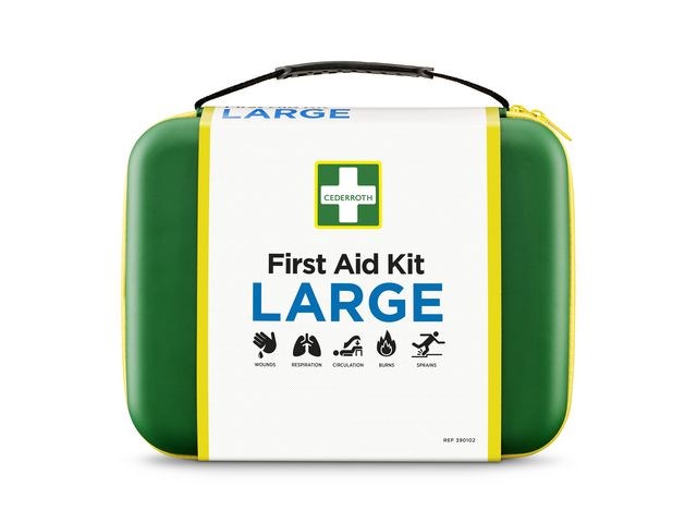- redo att användas. Cederroth First Aid Kit Large är ett bra komplement till väggfast utrustning för verksamheter som ofta är på språng. Cederroths Första Hjälpen-Kits har uppgraderats med ny design i signalfärger och förbättrad användarvänlighet, de är också utrustade med välbeprövade produkter som är enkelt utformade och försedda med tydliga instruktioner. Väskan är utrustad med bärhandtag och är lätt att bära med sig. Den är gjord i ett tåligt formpressat material som tål tuffa tag och skyddar innehållet mot damm och smuts. Väskan kan bredas ut på marken för bättre överblick, produkterna är förpackade i transparenta plastfickor vilket gör det lätt att hitta rätt produkt när varje sekund räknas. Det finns utrymme för komplettering av eget tillval.Väskan är välutrustad med produkter för små och stora sår, stukningar, brännsår, cirkulationssvikt samt skyddsprodukter vid HLR.