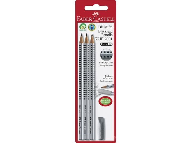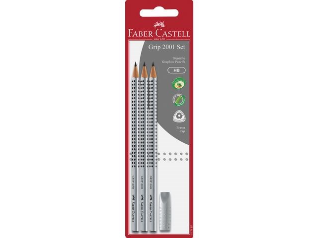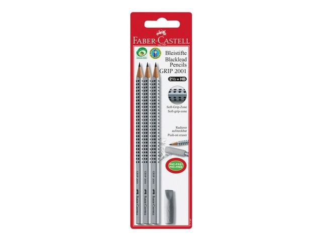 Blyertspennan Faber-Castell GRIP 2001 HB har en ergonomisk triangelform och en mjuk greppzon som gör det enkelt att skriva. Blyertspennan HB Faber-Castell GRIP 2001 är konstruerad för att tåla tryck som uppkommer vid långvarigt skrivande och ritande. Den trekantiga formen säkerställer att du skriver utan ansträngning, med mindre värk och trötthet, och pennans mjuka grepp garanterar att du kan skriva utan att pennan glider. Stiftet är fullständigt sammanlänkat med träet vilket ger den maximal hållbarhet. Den här förpackningen med 3 blyertspennor innehåller också ett PVC-fritt suddgummi som kan fästas i änden på pennan. Suddgummit fungerar inte bara för att radera fel utan kan också fästas över pennspetsen för att skydda den. Dessutom kommer mer än 95% av träet i den här blyertspennan från FSC®-certifierade och hållbara källor. Ytbeläggningen består av miljövänlig vattenbaserad färg, vilket gör pennan till ett utmärkt miljövänligare val.