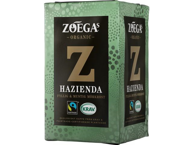 Ekologiskt kaffe från Zoega med en välbalanserad fyllighet med friska inslag. Zoegas Hazienda är ett mörkrostat malt kaffe med en frisk och välbalanserad fyllighet. Kaffet har toner av plommon och nötter. Bönorna som används till Hazienda kommer från certifierade odlingar i Östafrika, Central- och Sydamerika. Bönorna är 100% arabicabönor.