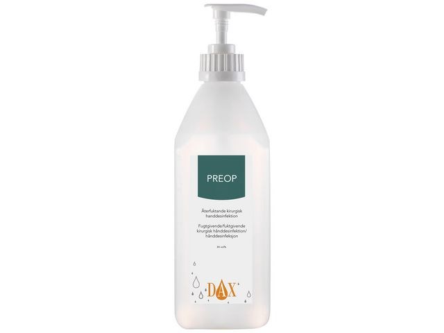 Kirurgisk handdesinfektion effektiv mot bakterier, svampar och virus. DAX Preop 80 används främst vid operationsavdelningar för kirurgisk handdesinfektion och vid specialavdelningar där sjukdomsalstrande mikroorganismer skall avdödas. DAX Preop 80 är en kirurgisk handdesinfektion sammansatt av fyra olika alkoholer med etanol som huvudkomponent. Alkoholstyrkan är 80 volymprocent. DAX Preop 80 verkar snabbt och klibbar inte efter avdunstning. Tillsatsen av glycerin som återfuktningsmedel gör att huden behåller sin naturliga fuktighetsbalans och hindrar därmed uttorkning. Effektiv mot bakterier, svampar och olika typer av virus som HIV, Hepatit B och C. Testad och godkänd enligt EN 1500, EN 14476, EN 13727, EN 13624, EN 12791, EN 14348.