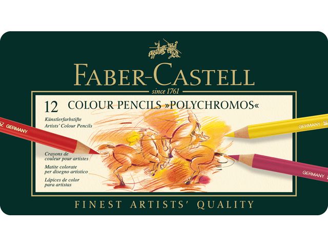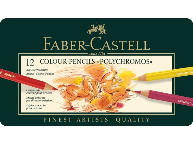 Polychromos pigmentstarka färgpennor i hög kvalitet för både professionella användare och hobbyanvändare. Polychromos från Faber Castell är högkvalitativa, pigmentstarka färgpennor. Polychromos artister värdesätter dessa pennor för sin kvalitet och höga standard. Den höga standarden och kvaliteten syns tydligt, oavsett om pennorna används för grafik, konstnärlig fri stil eller för exakt återgivning av ritningar. Pennorna är vattenresistenta och smetar inte. Pennorna levereras i snygg och praktisk plåtask. Pennvässare 784907 rekommenderas.