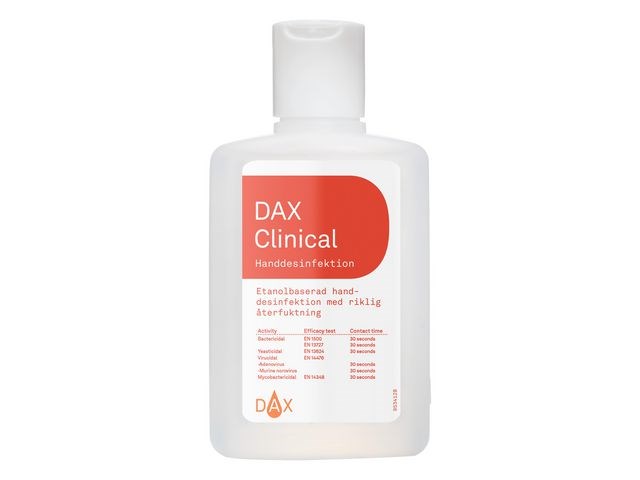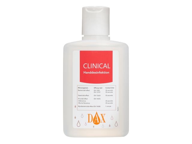 DAX Clinical mycket effektiv mot bakterier, jästsvamp och olika typer av virus. En god handhygien och rutinmässig användning av handsprit är mycket viktigt för att förebygga smittspridning. För effektiv desinfektion av händer inom sjukvården, tandvården, äldrevården, livsmedelssektorn etc. Mycket lämpligt att även ha hemma för att stoppa smittspridningen mellan familjemedlemmar när det är perioder med influensa, förkylning och vinterkräksjuka eller när man är på resande fot och inte har tillgång till tvål och vatten. Hygienisk handdesinfektion som innehåller 75 vol% denaturerad etanol. Desinfektionen innehåller två olika återfuktare och är kliniskt testad att klara dagligt vårdarbete, tack vare återfukningen kan denna handdesinfektion användas dagligen. DAX Clinical handdesinfektion är även mycket effektiv mot bakterier, jästsvamp och olika typer av virus, så som influensavirus, HIV och Murine Norovirus. Utprovad i samarbete med svensk sjukvård och testad enligt EN 1500, EN 13727, EN 13624, EN 14476 (ej polio) och EN 14348.