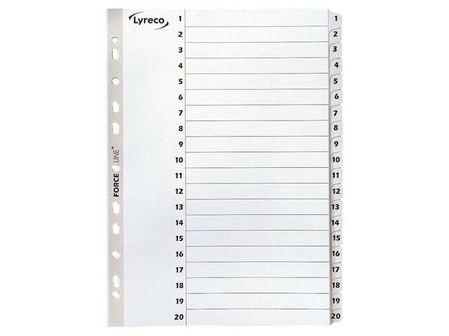Numeriskt mylar-register i A4-format med plastförstärkta nummerflikar och hålförstärkning som gör det extra slittåligt. Med siffror på både försättsbladet och registerbladen. Försättsbladet har fält att skriva innehållet i. Tillverkat av vit 160 g kartong. 11 hål med hålförstärkning av Force Line-typ.