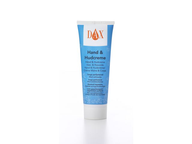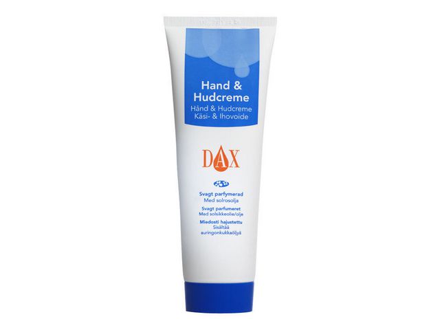 Lugna torra ställen och återfukta huden snabbt med DAX hand- och hudkräm, som hjälper till att bibehålla hudens fuktbalans. Smörj in denna DAX hand- och hudkräm på torra ställen för att lugna och återfukta dagligen. Denna snabbverkande kräm torkar in snabbt och lämnar händer och hud len utan klibbiga rester, medan den neutrala pH-balansen tar hand om känslig hud. Den passar utmärkt för daglig hudvård av såväl händer som hela kroppen och absorberas snabbt in i huden och återfuktar utan att kännas kladdig. Med solrosolja som hjälper dig att hålla fukten i balans är denna DAX hand- och hudkräm perfekt för daglig användning.
