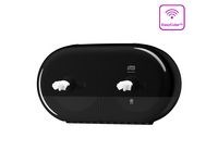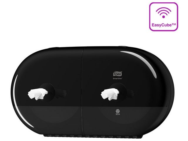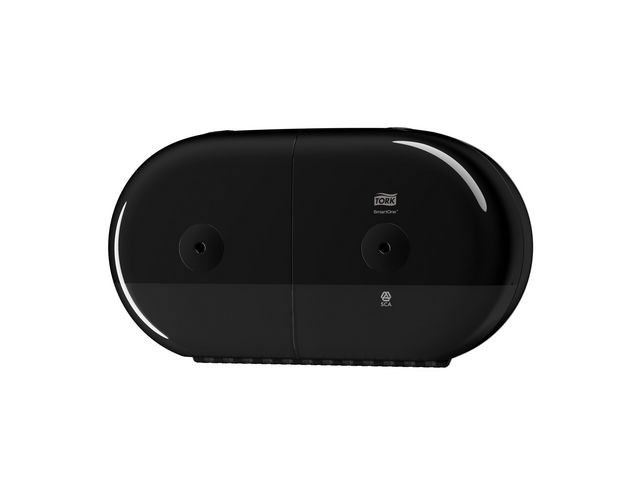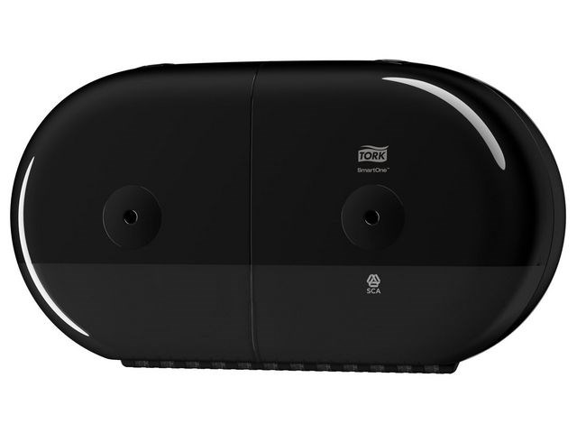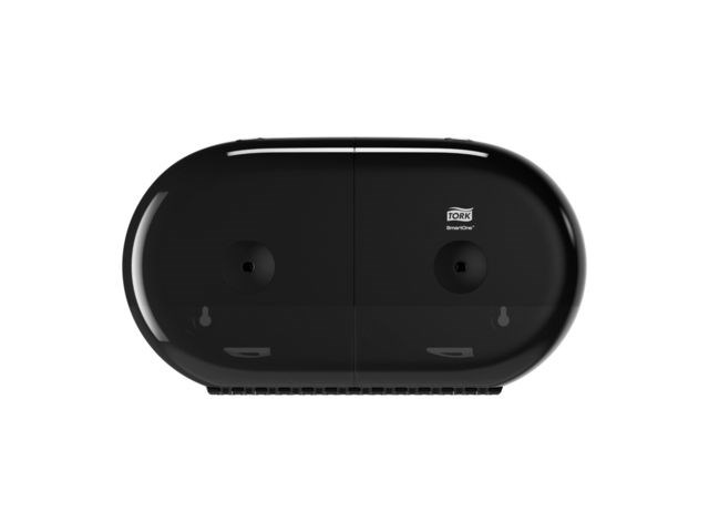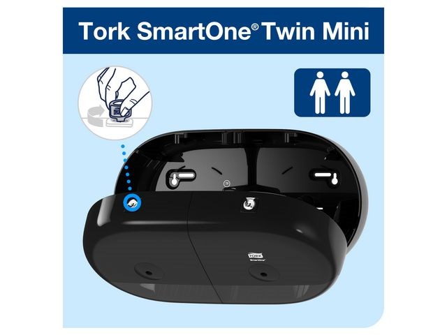 Tork dispenser med plats för två rullar. Tork SmartOne Twin Mini Dispenser rymmer två rullar som kan förbrukas helt för minskat avfall och underhåll. Utmatning av ett ark i taget minskar förbrukningen med upp till 40 % och gör så att fler gäster kan betjänas per rulle jämfört med jumbo-dispensrar. Dispensern bidrar till förbättrad hygien genom att gäster endast vidrör det papper de använder. Den moderna designen har ett praktiskt lås som skyddar rullarna från stöld. Kompatibel med Tork T9 refiller.