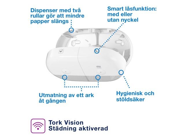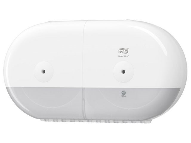 Tork dispenser med plats för två rullar. I välbesökta utrymmen är risken stor för pappersbrist och onödigt avfall. Tork SmartOne Twin Mini Dispenser rymmer två rullar som kan förbrukas helt för minskat avfall och underhåll. Utmatning av ett ark i taget minskar förbrukningen med upp till 40% och gör så att fler gäster kan betjänas per rulle jämfört med jumbo-dispensrar. Dispensern bidrar till förbättrad hygien genom att gäster endast vidrör det papper de använder. Den moderna designen har ett praktiskt lås som skyddar rullarna från stöld. Kompatibel med Tork T9 refiller.