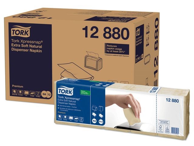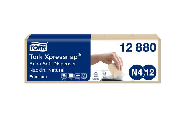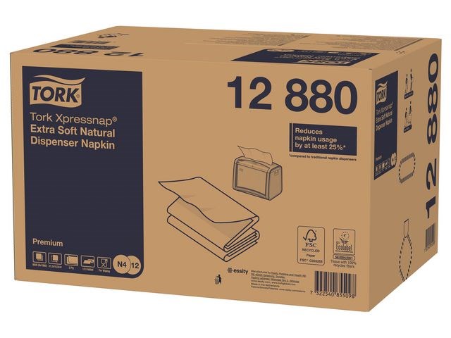 Slitstark och bra servett! Passar bra till dukningen eller att ha med på picknicken! Tork Xpressnap Servettdispenser är ett utmärkt val för restauranger med självbetjäning. Med detta system minskar du förbrukningen med minst 25 % jämfört med vanliga servettdispensrar. Tork Xpressnap Extra Mjuk Natur Dispenserservett (2-lagers) tillverkas av 100 % återvunnet papper och passar perfekt om du vill visa att du värnar om miljön. Biologiskt nedbrytbar och komposterbar (EN 14995) samt tillverkad av 100 % återvunnet papper, så att du kan visa att du är mån om miljön. Avsaknaden av blekmedel eller färgämnen skapar en naturlig färgton. Unik förpackning där buntarna skyddas i en plastpåse som ger bättre hygien och enklare hantering. Engagera kunderna med eget tryck