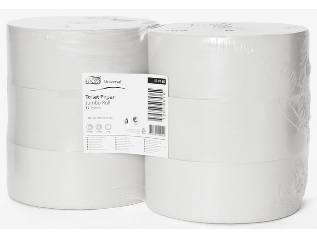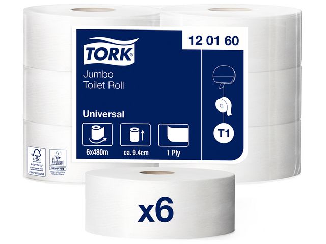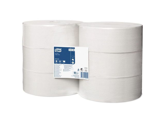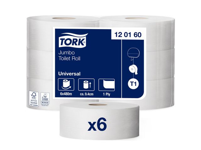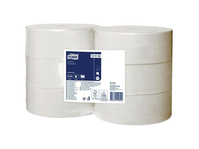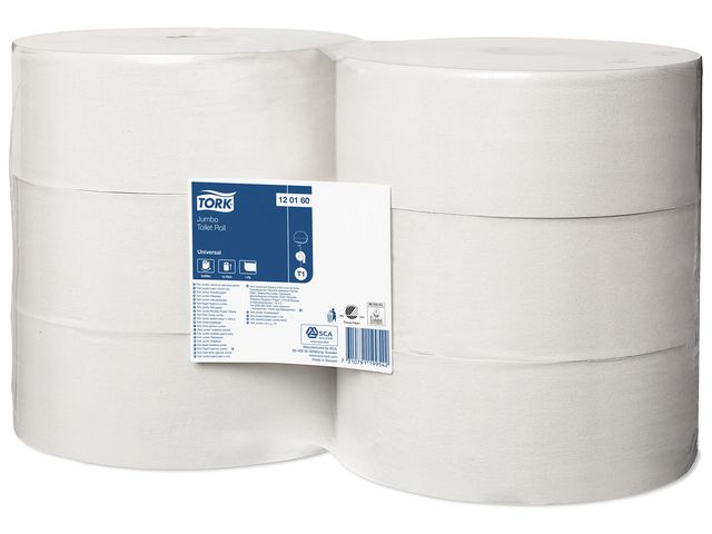 Toalettpappret Tork Universal Jumbo T1 är ett utmärkt och praktiskt val för offentliga toaletter med hög genomströmning. Toalettpappret Tork Universal Jumbo T1 är tillverkat av 100 % återvunnet material och lämpar sig för offentliga toaletter med hög genomströmning, till exempel flygplatser, restauranger och offentliga toaletter. 1-lagers rullar är kostnadseffektiva, miljövänligarea och kompatibla med de flesta toalettpappersdispensrarna. Det är ett utmärkt val eftersom de uppfyller standarderna för komfort, särskilt för folk på språng. Toalettpappret Tork Universal Jumbo T1 har både EU Ecolabel och FSC-miljöcertifieringar, lång livslängd och kräver lite underhåll. Om det är hygien och komfort du vill ha är toalettpappret Tork Universal Jumbo T1 den mest effektiva lösningen.