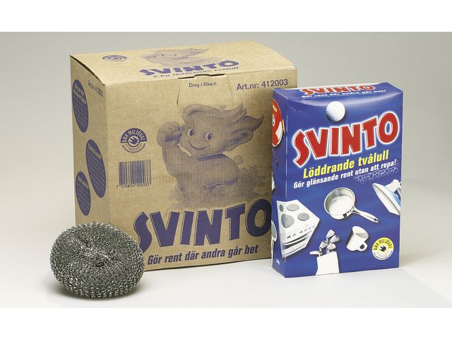 Du kan rengöra på djupet med Svinto® stålull, som effektivt tar bort envisa fläckar och avlägsnar intorkade matrester från nästan all slags disk. Svinto® stålull fungerar effektivt för att ge skinande rena och strimfria resultat. Den här skursvampen är utformad för att underlätta vardaglig diskning, eftersom den rengör de flesta köksredskap på djupet genom att eliminera intorkade matrester, olja och fettfläckar. Du kan även använda den på cyklar, barnvagnar, kastruller eller inuti ugnen.