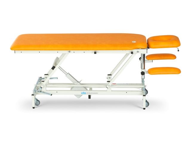 Delta Standard är en klassisk behandlingsbänk som är mycket omtyckt och den passar perfekt som behandlings-, undersöknings- eller massagebänk om man inte har så stora krav på stabilitet och höjdlägen. Denna bänk har en huvuddyna med andningshål som kan justeras steglöst med en gaskolv. Höjden justeras hydrauliskt från båda sidor och kan ställas in mellan 57-87 cm. Armstöden är också höj- och sänkbara. Bänken har fällbara sidodynor, en O-formad huvuddyna och hjul med centrallås för smidig förflyttning och stabilitet. Den nya ramen har förbättrad stabilitet, och mjukvaran erbjuder bättre motorstyrning och säkerhetsfunktioner, inklusive klämdetektering. Smidigare hjullyft och modernare motor ger bättre funktion. Fotbågen är tystare och stadigare, arm- och sidostöden enklare att justera. Dolda kablar ger en snyggare design och fler ytor är lättare att rengöra. Anpassningsbart höjdområde finns. Varje bänk levereras med ett skötselpaket för klädseln som består av en borste, en microfiber duk och en flaska Desiplint desinfektionsmedel, 200 ml.