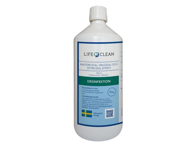 Rengör och desinficerar ytor och redskap, innehåller ej alkohol eller klor. Dokumenterad effekt mot virus och bakterier. High-level desinfektion med högt avdödningsspektrum för icke-invasiva medicintekniska produkter, avsedda för rena förhållanden (synbart rent). LifeClean har 100% desinficeringseffekt och är utvärderad som high-level desinfektion vid Statens Serum Institut (SSI). High-level disinfectantsmedel, full effekt inom 2 minuter. Med baktericidal, fungicidal, virucidal och sporicidal effekt. Med LifeClean desinfektion avlägsnar du effektivt smuts och tidigare applicerade kemikalier. Applicera en generös mängd LifeClean desinfektion på en ren trasa och torka ytan. Efter desinfektion, torka av ytan om det råder osäkerhet kring materialkompatibilitet med desinfektionslösningen. Regelbunden avsköljning med vatten rekommenderas. Godkänd enligt EN-standarder för bakterier, virus, svamp, jäst, mykobakterier enligt EN 13697, EN 13704, EN 14476, EN 13727, EN 14563, EN 14348, EN 13624, EN 14562.