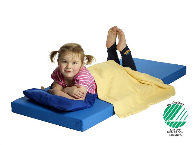 Madrassen Trygg är en Svanen-märkt vilmadrass. Perfekt madrass att använda på förskolor för vila. Madrassen har ett blått fodral tillverkad av ett 2-skiktsmaterial, bestående av 51% polyesterväv och 49% polyurethan med polyesterfiberkärna.