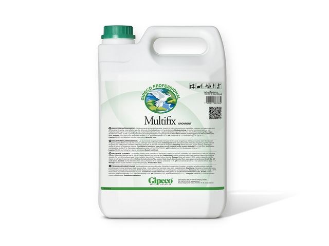 Högeffektivt lågskummande grovrengöringsmedel, tensidbaserat utan kolväten. Gipeco Multifix är avsedd för krävande rengöring av verkstäder, maskiner och lagerlokaler, samt vid industriell rengöring. Har ett brett användningsområde och är speciellt utformat för att snabbt tränga igenom och effektivt lösa upp fet smuts och feta beläggningar innehållande olja, sot, fett etc. Är även effektivt för borttagning av handbollsklister. Kan användas för både manuell rengöring och städmaskin.