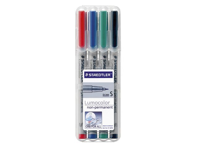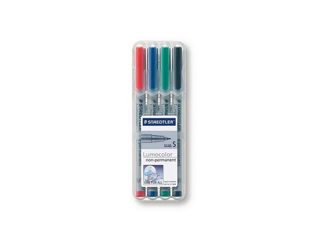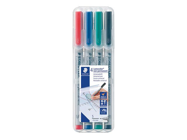 Lumocolor® Non-permanent penna tillverkad av 97 % återvunnen pre-consumer plast, för användning på nästan alla ytor. Lämplig för overheadfilm, kan torkas av med en fuktig trasa. Vattenlösligt bläck. Snabbtorkande. PP-skaft och hätta garanterar lång livslängd. Flygsäker