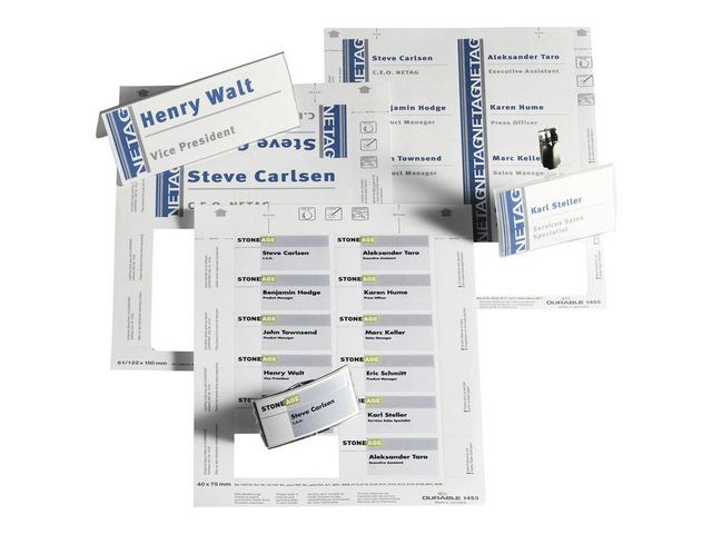 Insticksetiketter på A4-ark för utskrift i laser- eller inkjet skrivare. Lätt att dela etiketterna med microperforering. Programvara finns att ladda ner som hjälper dig att skriva ut personligt designade etiketter på www.durable.se. Insticksetikett 75x40mm (BxH). 150 grams papper. 12 etiketter per ark, 20 ark per förpackning.