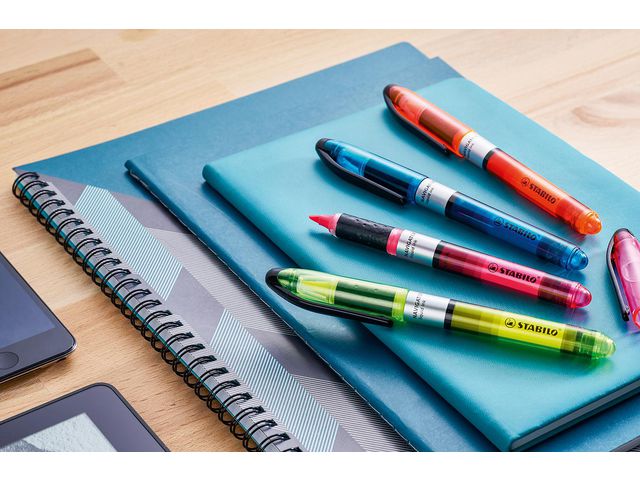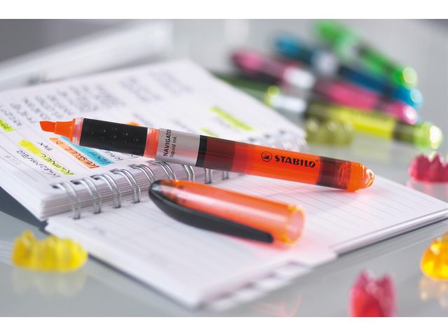 Markera text och viktig information med överstrykningspennan STABILO® NAVIGATOR® som är utrustad med en slimmad transparent pennkropp och en praktisk klämma för när du är på språng. Den eleganta överstrykningspennan STABILO® NAVIGATOR® har en slimmad transparent pennkropp så att bläcket är synligt och kan övervakas samt en mjuk greppzon som gör den bekväm att använda. LUMINATOR® är perfekt för daglig användning av studenter och yrkesverksamma som ofta är i rörelse och den har ett pålitligt vattenbaserat bläck med Anti-Dry-Out-teknik så att korken kan vara av under 4 timmar utan att den torkar ut. Den kan användas på nästan alla typer av papper. Bläcket kommer att appliceras jämnt ända till sista droppen. Den har en robust snedskuren spets som ger dubbla linjebredder på 1 respektive 4 mm så att du kan använda den i många olika sammanhang, till exempel för att skriva, stryka under eller markera. Överstrykningspennan finns i en mängd attraktiva färger och har en praktisk klämma så att du kan ta den med dig.
