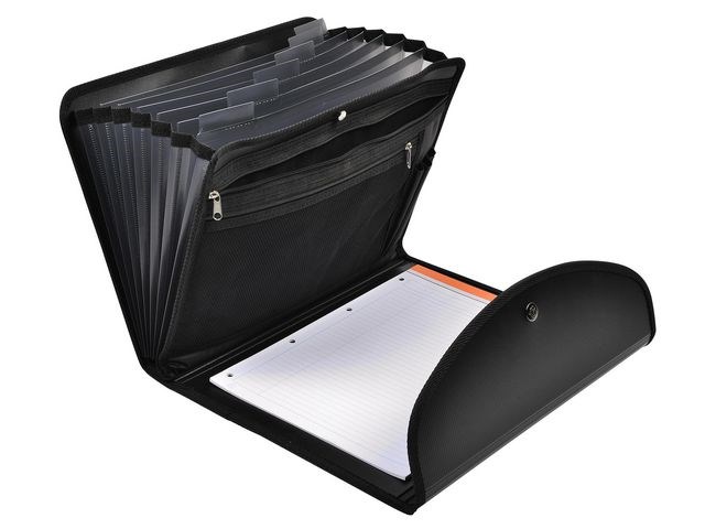 Med sorteringsmappen Exacompta Exafolio Exactive® kan du bära med dig dina dokument och allt du behöver för att göra anteckningar på ett organiserat sätt. Sorteringsmappen Exacompta Exactive® har en utdragbar mapp med sex fack som rymmer upp till 200 ark med A4-papper. Flikavdelare med etiketter gör arkiveringen av dina viktiga dokument i kategorier smidig. Dessutom levereras mappen med två fickor med blixtlås, flera pennhållare och ett anteckningsblock som kan bytas ut mot valfri typ av block eller skrivbok, till exempel ett anteckningsblock med spiralrygg. Den här sorteringsmappen är lätt och robust och tillverkad av innovativ 80 % återvunnen polypropylen. Den är en idealisk lösning för när du vill bära med dig och skydda dina dokument och allt du behöver för att göra anteckningar.