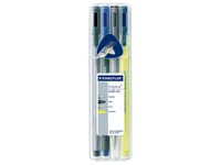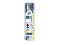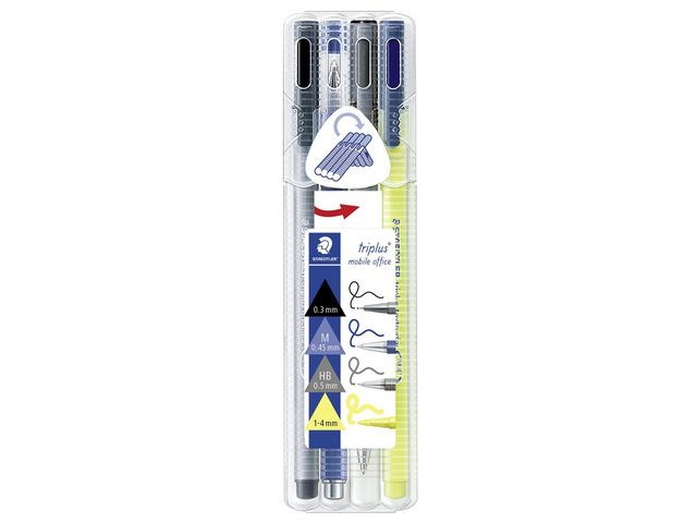 STAEDTLER Triplus® Mobile Office 34 paketet innehåller viktiga kontorsverktyg i en smidig och kompakt förpackning. Det här bärbara kontorspaketet innehåller en fineliner, en spetspenna, en mekanisk stiftpenna och en överstrykningspenna, allt i en kompakt förpackning. Triplus® finelinern innehåller vattenbaserat bläck som inte torkar även om korken är av under flera dagar. Paketet innehåller en triplus® spetspenna med en ergonomisk, gummiklädd pennkropp som är extremt bekväm att greppa. Triplus® lilla mekaniska stiftpenna har en förkromad metallspets och en trekantig pennkropp som ger enkel och avslappnad användning. Paketet innehåller dessutom en triplus® textsurfer® överstrykningspenna som har en mjuk, reglerbar spets och som passar utmärkt för överstrykning av tunn text.