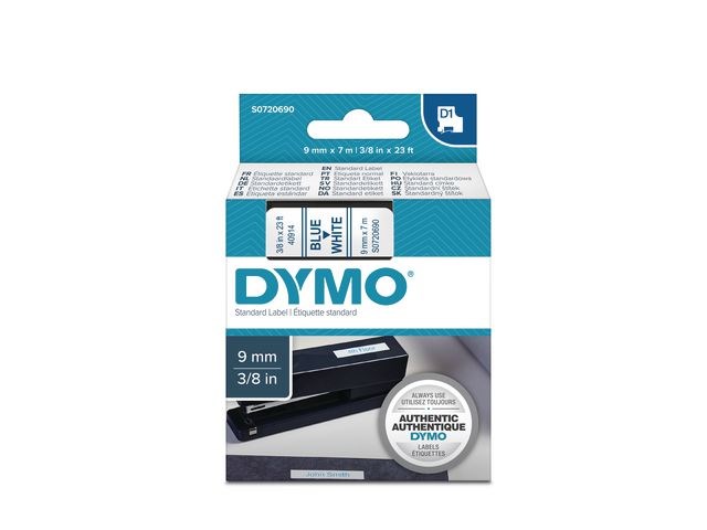DYMO D1-etiketter erbjuder den prestanda och omväxling du behöver för alla typer av märkning, både inomhus, utomhus, på kontoret, i verkstaden, i butiken eller någon annanstans. Etikettkassetten DYMO® D1 på 9 mm ger snygga, skräddarsydda etiketter med blå text på vit botten som passar perfekt för användning både inomhus och utomhus. D1-tejp med text som har skrivits ut med termisk överföringsteknik