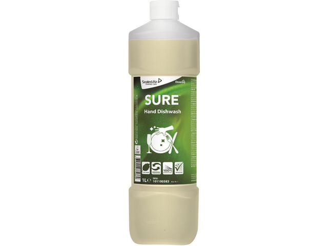 Ett säkert och miljömedvetet handdiskmedel för rengöring av grytor, kastruller, porslin, glas och alla diskbara köksredskap. SURE Hand Dishwash från Diversey är ett miljömedvetet och väldigt effektivt val. Lösningarna är växtbaserade, 100 % nedbrytbara och använder förnybara energikällor. Det här koncentrerade diskmedlet är tillräckligt kraftfullt för att ta bort även de tuffaste smutsfläckarna på krukor och porslin. Tillsätt helt enkelt till diskvatten och använd för att skrubba och skölja. Sammansättningen ger dig ett resultat utan ränder på all disk, inklusive glas och bestick. SURE-serien erbjuder professionella rengöringsprodukter som är utformade för att uppfylla kraven på effektivitet och tar även hänsyn till miljön och människors hälsa. Alla produkter är vegetabiliska och tillverkade av förnybara energikällor som är 100 % nedbrytbara och utformade för effektivitet.