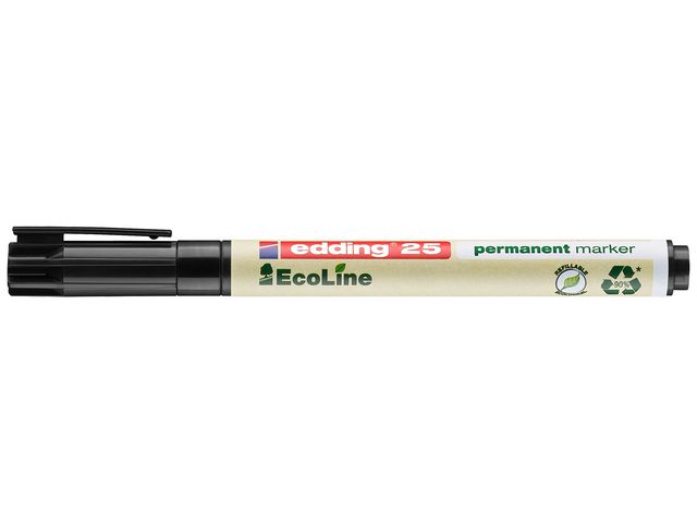 Med den permanenta märkpennan Edding 25 EcoLine kan du skriva på nästan alla ytor, och den består av plast som är tillverkat av 90 % återvunnet material. Den här permanenta Edding 25-märkpennan för finskrift står ut tack vare dess miljömedvetna material. Märkpennan har en kulformad spets med ett ungefärligt linjedrag på 1 mm och tack vare sitt ljusfasta och slitstarka bläck är den idealisk för användning på nästan alla ytor, som t.ex. plast, metall, glas, osv. Dess alkoholbaserade bläck har svag lukt och är fritt från xylen och toluen. Märkpennan Edding 25 är precis som alla andra permanenta märkpennor från EcoLine-sortimentet tillverkad av 90 % återvunnet material.