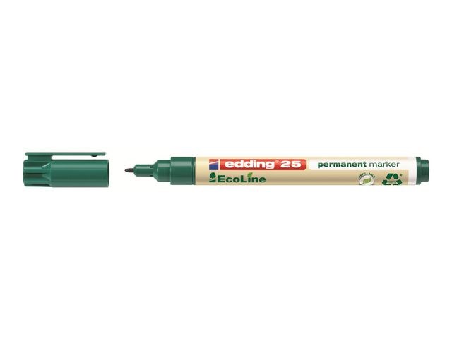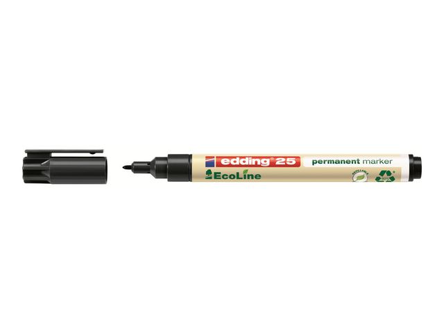 Med den permanenta märkpennan Edding 25 EcoLine kan du skriva på nästan alla ytor, och den består av plast som är tillverkat av 90 % återvunnet material. Märkpennan Edding 25 är precis som alla andra permanenta märkpennor från EcoLine-sortimentet tillverkad av 90 % återvunnet material. Märkpennan har en kulformad spets med en ungefärligt linjebredd på 1 mm och tack vare sitt ljusfasta och slitstarka bläck är den idealisk för användning på nästan alla ytor, som t.ex. plast, metall, glas, osv. Dess alkoholbaserade bläck har svag lukt och är fritt från xylen och toluen.