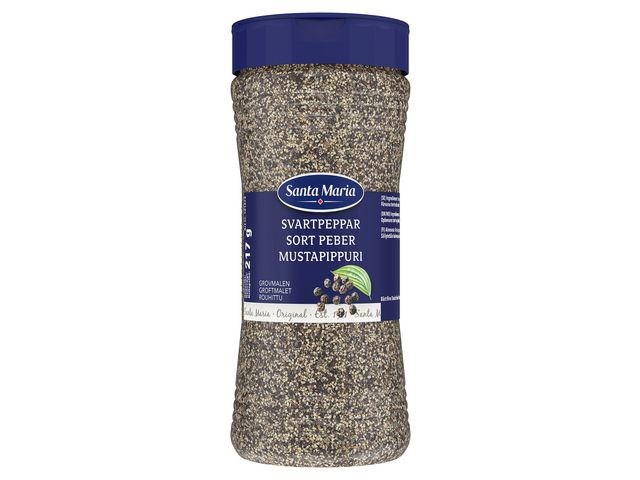 Svartpeppar Svartpeppar Grovmalen 217g. Ingredienser: Svartpeppar Näringsdeklaration: Energi (kcal) 276 kcal, Energi (kJ) 1158 kJ, Fett 3.30 g, Varav mättat fett 1.40 g, Kolhydrater 39 g, Varav socker 0.60 g, Fiber 25 g, Pr... Läs mer